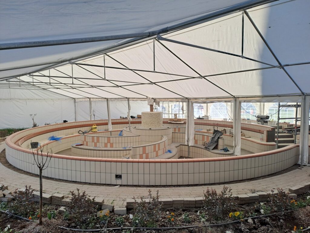 Gyula Várfürdő referencia. Polip gyógy medence teljeskörű felújítása. Január végén kezdtünk. Nagy pénteken üzemszerűen működnie kell. Saját sátor építése 350 m2 lefedve vízmentesen, füthetően. Termoventillátorokkal fűtve. A segédanyagok a Mapei termékei. A medencecsempe a Nèmet Agrob Buchtal